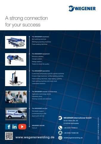 Welding nozzlesfor Hot Gas Welding TorchesHot Gas Welding TorchesTacking nozzleMatching welding nozzles and fans for all of our hot gas welder models are available for every application. We can supply highquality, precision stainless steel nozzles as round, tacking and speed welding nozzles and as speed welding nozzles with tacking tip.Round nozzleRound nozzles with tacking tipHigh speed welding nozzlesBand Welding Nozzle with teflon rollBand Welding Nozzle with steel roll13150 SSD/band 18 mm20216 SSD/band 18 mm (with extension)Wide slot nozzles10187 Tacking nozzle, model HD10186 RD 4, for air outlet %u00d8 4 mm10172 RD/HD 3, for air outlet %u00d8 3 mm10185 RD/HD 4, for air outlet %u00d8 4 mm11168 SSD/band 12 mm11169 SSD/band 15 mm11170 SSD/band 18 mm11171 SSD/band 20 mm11172 SSD/band 25 mmProfile nozzles11001 SSD/Prof. 3 x 3 x 4, for profile wire 90-411002 SSD/Prof. 3 x 3 x 5, for profile wire 80 / 90-511003 SSD/Prof. 4 x 4 x 6, for profile wire 80 / 90-611722 SSD/Prof. 5 x 5 x 5, for profile wire11004 SSD/Prof. 5 x 5 x 6, for profile wire11005 SSD/Prof. 5 x 5 x 7, for profile wire 80 / 90-711006 SSD/Prof. 6 x 6 x 8, for profile wire 90-811007 SSD/Prof. 7 x 7 x 7, for profile wire 60-718155 SSD/Prof. B&M rod, with re-inforced lip10175 SSD 3, for round wire %u00d8 3 mm10176 SSD 4, for round wire %u00d8 4 mm10177 SSD 5, for round wire %u00d8 5 mm22887 SSD 3, for round wire %u00d8 3 mm (45%u00b0 angled right)22888 SSD 3, for round wire %u00d8 3 mm (45%u00b0 angled left)22889 SSD 4, for round wire %u00d8 4 mm (45%u00b0 angled right)22890 SSD 4, for round wire %u00d8 4 mm (45%u00b0 angled left)Stainless steel cast nozzles13020 SSD 3C, for round wire %u00d8 3 mm17346 SSD 4C, for round wire %u00d8 4 mm22103 SSD 5C, for round wire %u00d8 5 mm22893 SSD 3C, for round wire %u00d8 3 mm (45%u00b0 angled right)22894 SSD 3C, for round wire %u00d8 3 mm (45%u00b0 angled left)22895 SSD 4C, for round wire %u00d8 4 mm (45%u00b0 angled right)22896 SSD 4C, for round wire %u00d8 4 mm (45%u00b0 angled left)Welding nozzle customized edition14416 Welding nozzle customized editionWelding nozzles for fluoropolymer processing24254 Cap Strip nozzle optimized for fluoropolymer processing 10 x 2 mm24191 Cap Strip nozzle optimized for fluoropolymer processing 12 x 2 mm24170 Cap Strip nozzle optimized for fluoropolymer processing 15 x 2,5mm17588 Speed Welding Nozzle Typ SD 4 mmHigh speed welding nozzles with tacking tip10173 SSD/HD 3, for round wire %u00d8 3 mm10174 SSD/HD 4, for round wire %u00d8 4 mm22891 SSD/HD 4, for round wire %u00d8 4 mm (45%u00b0 angled right)22892 SSD/HD 4, for round wire %u00d8 4 mm (45%u00b0 angled left)10181 SSD/HD 5, for round wire %u00d8 5 mm11721 SSD/HD 6, for round wire %u00d8 6 mmStainless steel cast nozzles with tacking tip11716 SSD/HD 3C, for round wire %u00d8 3 mm11715 SSD/HD 4C, for round wire %u00d8 4 mm22323 SSD/HD 5C, for round wire %u00d8 5 mm11173 Wide slot nozzle 15 mm (angled)11174 Wide slot nozzle 20 mm (angled)Accessories for Airtherm18401 Triple Nozzle for Airtherm2 1300/150018400 Nozzle %u00d8 5 mm, for Airtherm2 1300/150018397 Wide slot nozzle 20 mm, for Airtherm2 1300/150018398 Wide slot nozzle 40 mm, for Airtherm2 1300/150018402 Wide slot nozzle 70 x 10 mm, for Airtherm2 300018403 Wide slot nozzle 75 x 2 mm, for Airtherm2 3000A strong connectionfor your successCompetence connects.11/2025 subjected to changes and errorsThe WEGENER specialistsCustomised and product-specific special machinesCrease-hinge machines, surface welding systems,Pallet welding machines, edge sealing systems,foam welding machines and many morecustomised solutionsThe WEGENER machines Butt welding machinesWelding by bending machinesFoam welding machinesThe WEGENER equipmentExtrusion weldersHot gas weldersWedge weldersTesters to check the qualityThe WEGENER transfer of know-howApplication technology adviceFeasibility studyTraining courses and seminarsThe WEGENER serviceWorldwide supportCommissioning on siteSpare parts serviceWEGENER ONLINEVisit us!WEGENER International GmbHErnst-Abbe-Str. 30D-52249 Eschweiler+49 2403 70484-0+49 2403 70484-99info@wegenerwelding.de11505 Wide slot nozzle 30 mm11175 Wide slot nozzle 40 mmwww.wegenerwelding.de