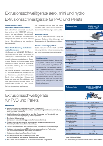 l WEGENER-Mikroprozessorsteuerung der 4. Generation f%u00fcr Luft- und Extrudattemperatur und zur Motorsteuerung inkl. Rezepturverwaltung f%u00fcr ausgew%u00e4hlte Materialien l Multifunktionales Farbdisplay f%u00fcr Ist- und Soll-Temperatur von Vorw%u00e4rmluft und Extrudat sowie Leistungsregelung des Hauptantriebs l Erweiterter Kaltstartschutz (temperatur- und zeitabh%u00e4ngiger Anlaufschutz des Ger%u00e4tes) l %u00dcberwachung der eingestellten Solltemperatur der Extrudattemperatur mit Motorstoppfunktion bei zu hoher Abweichung l Leicht auswechselbare PTFE-Schwei%u00dfschuhe, verstellbarer vorderer Handgriff l Modulare und adaptierbare LED-Beleuchtung zum optimierten Ausleuchten des Schwei%u00dfbereiches bei reduziertem Schattenwurf l Modulares und wartungsfreundliches Design l Im Lieferumfang ist ein Schwei%u00dfschuh Ihrer Wahl und ein integrierter oder externer Ger%u00e4test%u00e4nder enthalten l Alle Pellet Extruder sind mit ca. 1 Liter Granulatbeh%u00e4lter ausgestattetMerkmaleHandschwei%u00dfextruder %u2013 Leichtgewichte mit gro%u00dfer Leistung Seit Jahrzehnten entwickelt, konstruiert, baut und vertreibt WEGENER leistungsstarke und zuverl%u00e4ssige Handschwei%u00dfextruder. Sie verbinden eine besonders kompakte und leichte Bauweise mit einer hohen Schwei%u00dfleistung bei exzellenter Extrudatqualit%u00e4t. Ultraschnelle Steuerung der Extrudat und Lufttemperatur Alle Extruder der WEGENER EXWELD x4-Serie verf%u00fcgen %u00fcber einen Extrusionsteil mit vollwertiger 3-Zonen-Schnecke, eine ultraschnelle mikroprozessorbasierende Steuerung der Extrudat- und Lufttemperatur sowie des Hauptantriebes und einer patentierten thermischen Trennung des Extrusionsteils vom Antrieb. Die Extruder der EXWELD aero-Serie nutzen nur eine Energiequelle zur Vorw%u00e4rmung und zur Plastifizierung des Schwei%u00dfmaterials. Durch einen vollwertigen Extrusionsteil lassen sich eine gute Schwei%u00dfleistung und eine gute Schwei%u00dfqualit%u00e4t bei diesen EinKanal-Ger%u00e4ten erzielen. Die EXWELD miniSerie rundet das Liefer-spektrum ab. Der Entwicklungsfokus liegt bei dieser Ger%u00e4tebaureihe auf maximaler Handlichkeit bei minimalen Abmessungen und Gewicht. Modulares Design Ein Novum stellt das modulare Design dar, das dem Bediener kleine Wartungs- und Servicearbeiten in Eigenleistung erm%u00f6glicht. Breites AnwendungsspektrumSelbst anspruchsvolle Werkstoffe wie CPVC k%u00f6nnen problemlos mit den entsprechenden PVC-Extruderversionen verarbeitet werden.FunktionsweiseBeim Extrusionsschwei%u00dfen werden die zu f%u00fcgenden Bauteile unter Verwendung eines kontinuierlich zugef%u00fchrten Zusatzwerkstoffes (Schwei%u00dfdraht) verbunden. Idealerweise wird als Schwei%u00dfdraht ein artgleicher Werkstoff eingesetzt. In den von der Vorw%u00e4rmung (Warmgas) auf Bearbeitungstemperatur gebrachten Schwei%u00dfsto%u00df wird das vom Extruder kontinuierlich erzeugte Extrudat unter Druck aufgebracht. Extrusionsschwei%u00dfger%u00e4tef%u00fcr PVC und PelletsExtrusionsschwei%u00dfger%u00e4te aero, mini und hydro Extrusionsschwei%u00dfger%u00e4te f%u00fcr PVC und PelletsEnergieversorgung:Leistungsaufnahme:Luftbedarf:Heizleistung (Luft):Schwei%u00dfleistung (PVC):Schwei%u00dfleistung (PE):Schwei%u00dfleistung (PP):Schwei%u00dfdrahtst%u00e4rke:PVC (mm):PE und PP (mm):Extrudat:Gewicht:Abma%u00dfe (L x H x W in mm):EXWELD alpha4 SC PVCArtikel-Nr.: 41861EXWELD alpha4 EC PVCArtikel-Nr.: 41862EXWELD alpha4 SC PArtikel-Nr.: 41868EXWELD beta4 SC PArtikel-Nr.: 41870Technische Daten230 V 1/N/PE 50/60 Hz 3.660 WEigenluftversorgung2.200 W ca. 2,8 kg/h ca. 2,4 kg/h ca. 1,7 kg/h 3, 43, 4, 5-6,9 kg530 x 290 x 140230 V 1/N/PE 50/60 Hz 3.660 WEigenluftversorgung2.200 W -ca. 3 kg/h ca. 3 kg/h --Pellets / Granulat7,3 kg530 x 550 x 140230 / 400 V 1/N/PE 50/60 Hz 4.560 WEigenluftversorgung2.200 W -ca. 4,6 kg/h ca. 4,3 kg/h --Pellets / Granulat11 kg590 x 670 x 140230 V 1/N/PE 50/60 Hz 3.960 W>300 l/min2.500 W -ca. 3 kg/h ca. 3 kg/h --Pellets / Granulat6,7 kg530 x 550 x 135230/400 V 1/N/PE 50/60 Hz 5.360 W>300 l/min3.000 W -ca. 4,6 kg/h ca. 4,3 kg/h --Pellets / Granulat10,3 kg530 x 670 x 150230/400 V 1/N/PE 50/60 Hz 5.760 W>300 l/min3.000 W -ca. 6,2 kg/h ca. 5,6 kg/h --Pellets / Granulat10,5 kg590 x 670 x 150230 V 1/N/PE 50/60 Hz 3.960 W>300 l/min2.500 W ca. 2,8 kg/h ca. 2,4 kg/h ca. 1,7 kg/h 3, 43, 4, 5-6,3 kg530 x 220 x 135EXWELD alpha4 EC PArtikel-Nr.: 41869EXWELD beta4 EC PArtikel-Nr.: 41871EXWELD gamma4 EC PArtikel-Nr.: 42162Energieversorgung:Leistungsaufnahme:Luftbedarf:Heizleistung (Luft):Schwei%u00dfleistung (PE):Schwei%u00dfleistung (PP):Schwei%u00dfdrahtst%u00e4rke:PE (mm):PP (mm):Gewicht:Abma%u00dfe (L x H x W in mm):EXWELD mini F-CArtikel-Nr.: 18575EXWELD mini CArtikel-Nr.: 18637EXWELD aeroArtikel-Nr.: 30268EXWELD aero CArtikel-Nr.: 30269Technische Daten230 V 1/N/PE 50/60 Hz 3.000 WEigenluftversorgung 2.200 Wca. 2,6 kg/h ca. 2,2 kg/h3, 43, 45,8 kg535 x 355 x 110230 V 1/N/PE 50/60 Hz 3.000 WEigenluftversorgung 2.200 Wca. 2,6 kg/h ca. 2,2 kg/h3, 43, 45,0 kg535 x 355 x 110230 V 1/N/PE 50/60 Hz900 WEigenluftversorgung 250 W + 460 W(Lufterhitzer)ca. 0,7 kg/h-4-2,9 kg410 x 270 x 120230 V 1/N/PE 50/60 Hz900 W- 250 W ca. 0,7 kg/h-4-2,5 kg410 x 260 x 60Energieversorgung: US-Version Leistungsaufnahme: - Heizleistung (Warmgas): - Heizleistung (Extruder): - Heizleistung (%u00d6lvorw%u00e4rmung): - Hydraulikantrieb: - Luftversorgung: - Steuerung:Luftbedarf:Schwei%u00dfleistung (PE):Schwei%u00dfleistung (PP):Schwei%u00dfdrahtst%u00e4rke (mm): Gewicht: - Kopf: - Versorgungseinheit:Abma%u00dfe (L x H x W in mm):EXWELD hydro beta2Artikel-Nr.: 21999 / 21863 (US Version)Technische Daten230/400 V 3/N/PE 50/60 Hz230 V 3/PE 2,5 kVA0,4 kVA0,5 kVA3,0 kVA1,0 kVA0,1 kVA>300 l/minca. 4,8 kg/h ca. 4,3 kg/h PE / PP: 3, 4, 57 kg 63 kg700 x 600 x 1.000* ohne Zuleitung (Kabel)Im Lieferumfang ist ein Schwei%u00dfschuh Ihrer Wahl und ein integrierter oder externer Ger%u00e4test%u00e4nder enthalten.