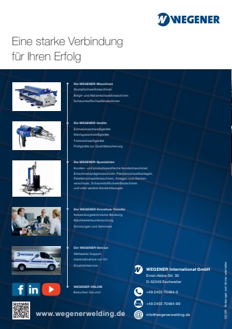 Eine starke Verbindung f%u00fcr Ihren ErfolgExtrusionsschwei%u00dfger%u00e4te aero, mini und hydro Kompetenz verbindet. 12/2025 %u00c4nderungen und Irrt%u00fcmer vorbehaltenExtrusionsschwei%u00dfger%u00e4te f%u00fcr PVC und PelletsDie WEGENER-SpezialistenKunden- und produktspezifische SondermaschinenEinschmelzpr%u00e4gemaschinen, Fl%u00e4chenschwei%u00dfanlagen,Palettenschwei%u00dfmaschinen, Anlagen zum Kantenverschluss, Schaumstoffschwei%u00dfmaschinenund viele weitere Sonderl%u00f6sungenDie WEGENER-Maschinen Stumpfschwei%u00dfmaschinenBiege- und Abkantschwei%u00dfmaschinenSchaumstoffschwei%u00dfmaschinenDie WEGENER-Ger%u00e4te Extrusionsschwei%u00dfger%u00e4teWarmgasschwei%u00dfger%u00e4teFolienschwei%u00dfger%u00e4tePr%u00fcfger%u00e4te zur Qualit%u00e4tssicherungDer WEGENER-Knowhow-TransferAnwendungstechnische BeratungMachbarkeitsuntersuchungSchulungen und SeminareDer WEGENER-ServiceWeltweiter SupportInbetriebnahme vor OrtErsatzteilservicewww.wegenerwelding.deWEGENER International GmbHErnst-Abbe-Str. 30D-52249 Eschweiler+49 2403 70484-0+49 2403 70484-99info@wegenerwelding.deWEGENER ONLINEBesuchen Sie uns!