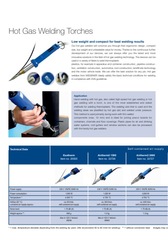Low weight and compact for best welding resultsOur hot gas welders will convince you through their ergonomic design, compact size, low weight and unbeatable value for money. Thanks to the continuous further development of our devices, we can always offer you the latest and most innovative solutions in the field of hot gas welding technology. The devices can be used in a variety of fields to weld thermoplastic plastics, for example in apparatus and container construction, pipeline construction, ventilation construction, automotive, roof construction, landfill site technology and the motor vehicle trade. We can offer the best solution for any job. Hot gas welders from WEGENER ideally satisfy the basic technical conditions for welding in compliance with DVS guidelines.Range of Application:Tanks and containersPipeline constructionVentilation systemsAutomotiveRoofingLandfill technologyCar repairApplicationHand welding with hot gas, also called high-speed hot gas welding or hot gas welding with a torch, is one of the most established and oldest methods for welding thermoplasts. The welding wire that is used and the welding areas are plastified by hot gas (air) and welded under pressure. This method is used primarily during work with thin-walled components (max. 10 mm) and is ideal for joining precut boards for containers, channels and floor coverings. Plastic pipes for air and drinking water systems, roof gutters and window sections can also be processed with the handy hot gas welders.Hot Gas Welding TorchesFeaturesl Very handy, compact devices and slim designl Self-contained powerful air supplyl Heating element safety cutoutl Integrated output controll Duratherm3 SC2 und Autotherm4 SC2:combines the device features listed below with the powerful SC2 blower unitl Exotherm: integrated temperature control, infinitely variable adjustment of welding temperature via push button, brushless blower motor, display of the actual and targettemperature in the plaintext display and heating element safety shut off if the air support failsl Temperature range infinitely variableDT 6LItem no. 10826WEG AB 60Item no. 24528WEG AB 120LItem no. 24530Our blowers reliably supply hot gas welders with filtered and costant air volume. All our blowers are characterized by their low weight and exceptionally low running noise. BlowerItem no. 45438 (4 m)Item no. 45441 (8 m)each with blower model DT 6Lfor two hot gas weldersItem no. 45439 (4 m)Item no. 45442 (8 m)each with blower model WEG AB 120Lfor two hot gas weldersItem no. 45440 (4 m)Item no. 45443 (8 m)each with blower model WEG AB 60Basic kitDuratherm3Item no. 45444 (4 m)Item no. 45447 (8 m)each with blower model DT 6Lfor two hot gas weldersItem no. 45445 (4 m)Item no. 45448 (8 m)each with blower model WEG AB 120Lfor two hot gas weldersItem no. 45443 (4 m)Item no. 45446 (8 m)each with blower model WEG AB 60Basic kitAutotherm4Hot gas welders with self-contained air supplyOur hot gas welders with their self-contained air supply and integrated fans are ideal for assembly work and for operation on buildingsites.Basic kitsAll our Basic kits include:l 1 Hot gas welder Duratherm3 or Autotherm4with stated length and corresponding blowerl 1 tacking Nozzle HD1 round nozzle RD 4 mm1 speed welding nozzle SSD 4 mml 1 round brush for cleaning nozzlesl 1 Carrying casePicture Basic kitAutotherm4 WEG AB 120Ll illuminated welding areal ergonomically optimized handlel one hose for air and power supplyl Quick-change system - nozzle adapter for quick nozzle changesl 270%u00b0 rotatable hose connection including kink protectionl air shortage and heating element protection shutdown, integrated air volumemonitoringl 800 W heating elementl available with 4 m or 8 m hose supply linel Duratherm3: integrated power control, LCD display showing the set power levell Autotherm4: integrated temperature control, stepless adjustment of the welding temperature via control buttons, LCD display showing the actual and target temperature in plain text, recipe management for all common materialsHot gas welders Featureswith external air supplyOur latest generation of externally airsupplied hot gas welding devices, Duratherm3 and Autotherm4, sets new standards in plastic welding technology! Both systems offer the optimal basis for quality-oriented plastic welding.A special highlight is the newly developed quick-change system for the nozzle adapter. This allows nozzles equipped with the adapter to be changed quickly and even when hot %u2013 for virtually uninterrupted working.Picture Autotherm4Power supply: Power consumption: Temperature *: Airflow (20 %u00b0C) contained air supply approx.:Noise level:Weight approx.**:Technical DataExotherm Airtherm2 1500 Airtherm2 3000 Duratherm3 SC2 Autotherm4 SC2 Item no. 25555 Item no. 33726 Item no. 33727 Item no. 45289 Item no. 45291230 V 1/N/PE 50/60 Hz 885 W %u2264 600 %u00b0C 40 - 60 l/min. self-contained air supply< 70 dB (A)965 gAlso in 120 V Version:45290230 V 1/N/PE 50/60 Hz 885 W %u2264 600 %u00b0C 40 - 60 l/min.self-contained air supply< 70 dB (A)965 gAlso in 120 V Version:45292230 V 1/N/PE 50/60 Hz 1,000 W %u2264 600 %u00b0C ca. 60 l/min.self-contained air supply< 70 dB (A)860 gAlso in 120 V Version:25556230 V 1/N/PE 50/60 Hz 1,500 W %u2264 700 %u00b0C ca. 300 l/min.self-contained air supply< 70 dB (A)1.2 kgAlso in 120 V Version:38060230 V 1/N/PE 50/60 Hz 3,000 W %u2264 700 %u00b0C ca. 400 l/min.self-contained air supply< 70 dB (A)1.3 kgDuratherm3 Autotherm4 230 V 1/N/PE 50/60 Hz 800 W up to 600 %u00b0C 40 - 60 l/min.external air supply465 gAlso in 120 V Version:45255 (4 m)45256 (8 m)230 V 1/N/PE 50/60 Hz 800 W up to 600 %u00b0C 40 - 60 l/min.external air supply465 gAlso in 120 V Version:45259 (4 m)45260 (8 m)Item no. 45253 (4 m)Item no. 45254 (8 m)Item no. 45257 (4 m)Item no. 45258 (8 m)* = max. temperature deviates depending from the welding tip used. (We recommend 45 to 60 l/min for welding) ** = without connection lead Images may contain optional accessories.